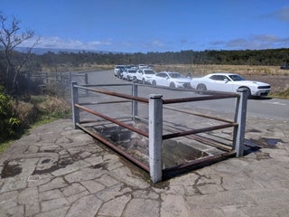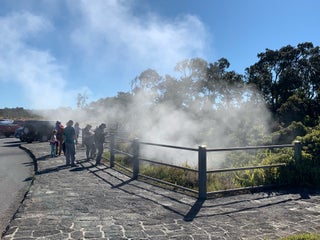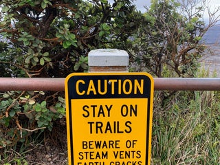 Be careful with the bars near the vents they get hot. Walk over to the viewing area to the volcano.