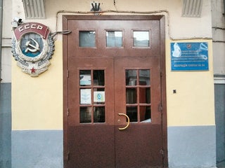У входа в колледж красуется прекрасный пережиток советского прошлого - цветной герб СССР