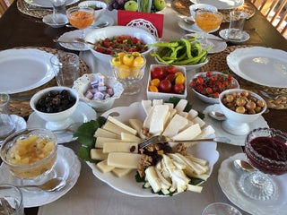 Zehra ve Hülya Hanımın misafirperverliği, müthiş kahvaltı masasıyla buluşunca harika bir sonuç çıkıyor ortaya.Itırlı, ıhlamurlu elma, sakızlı şeftali, gül ve kızılcık reçelleri nefis.Üzümler de cabası