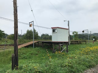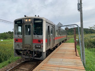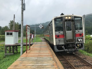 板張りホームの秘境駅。一日に停まる列車は、上り2本、下り3本のみ。